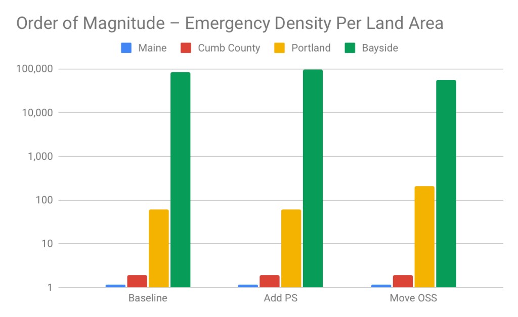 Shifting the lens to density of emergency beds per land area, the contrast is so extreme that only a logarithmic scale with units normalized to “emergency beds per 100 square miles” allows all levels to be plotted visibly on the same chart. The rightmost column illustrates that relocating Oxford Street Shelter’s capacity to Riverton would increase the rest of Portland’s share a bit, but barely makes a dent in the super-concentrated quarter mile shelter cluster in Bayside.