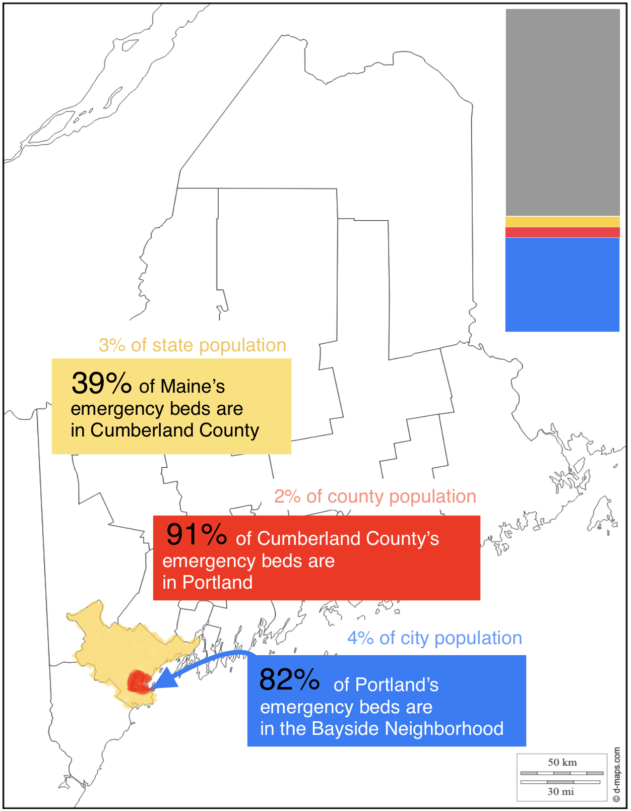 The below charts and graphs demonstrate the lack of equity in distribution of emergency shelters in Maine, Cumberland County, and Portland.